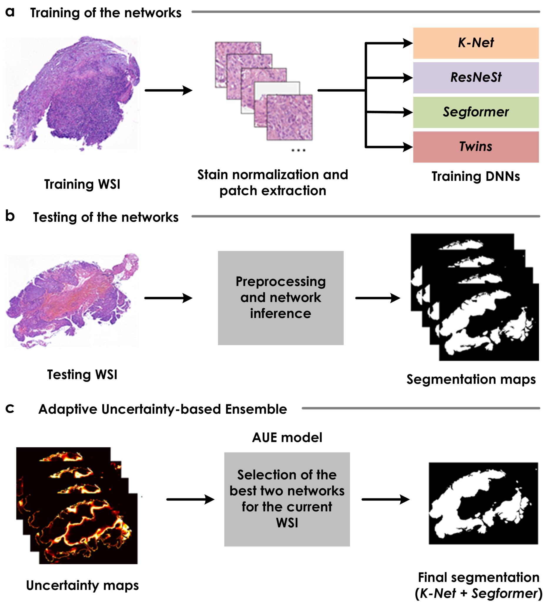 Ensemble models have emerged as a powerful technique for improving robustness in medical image segmentation. However, traditional ensembles suffer from limitations such as under-confidence and over-reliance on poor performing models. In this work, we introduce an Adaptive Uncertainty-based Ensemble (AUE) model for tumor segmentation in histopathological slides.