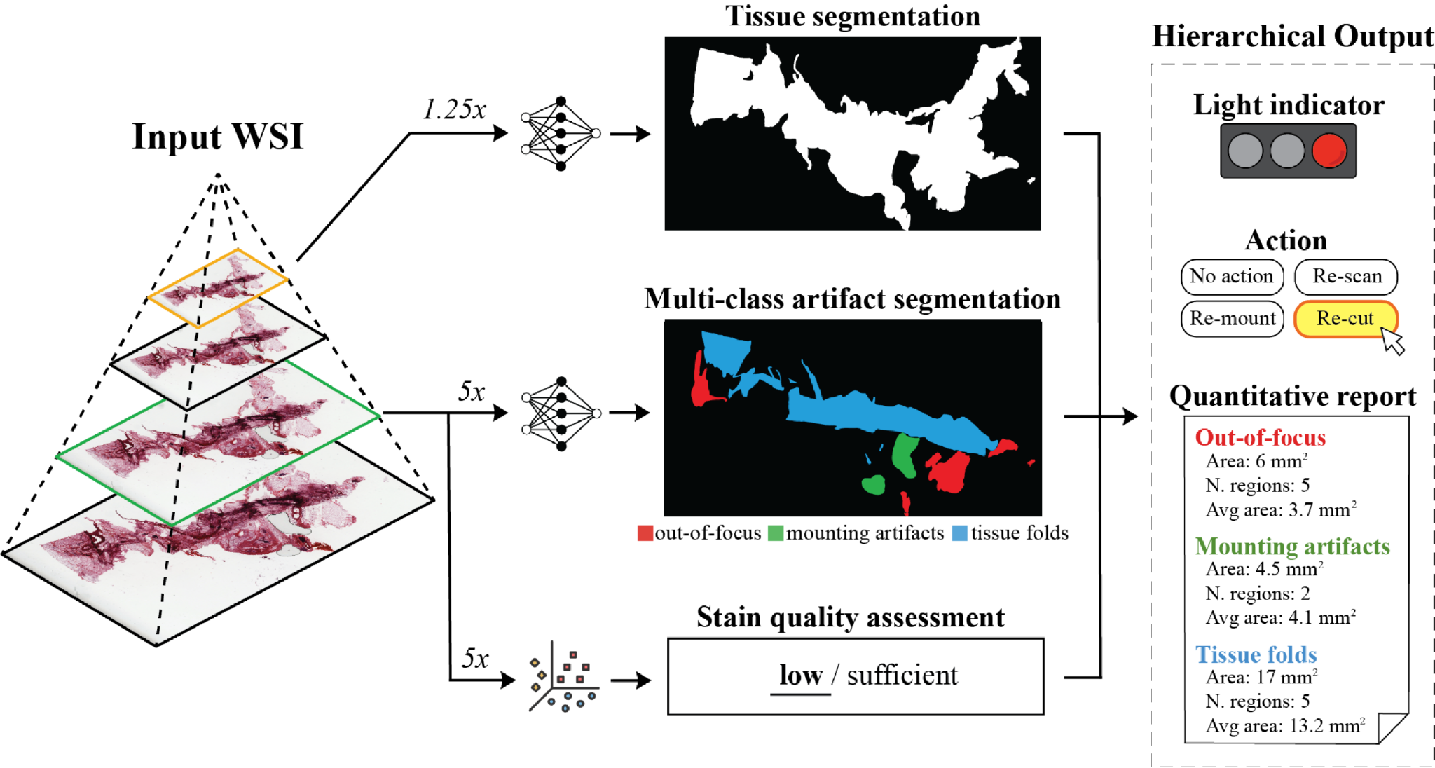 The presence of artifacts in whole slide images (WSIs), such as tissue folds, air bubbles, and out- of-focus regions, can significantly impact WSI digitization, pathologists’ evaluation, and the accuracy of downstream analyses. We present SlideInspect, a novel AI-based framework for comprehensive artifact detection and quality control in digital pathology.